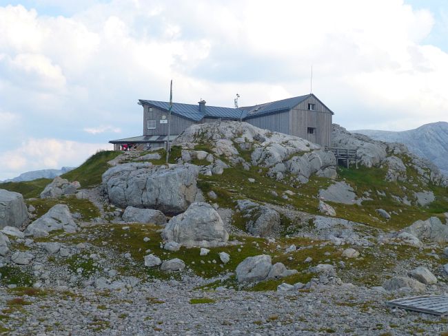 Wiesenabsatz darunter ist die Dachsteinsüdwandhütte zu erkennen.