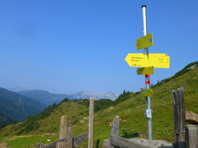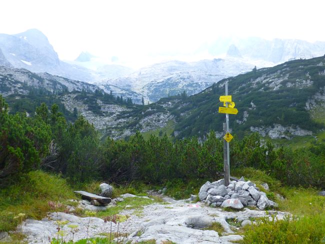 Bei diesem Wegweiser kann man rechts zum Wiesberghaus abzweigen. Das Wetter ist