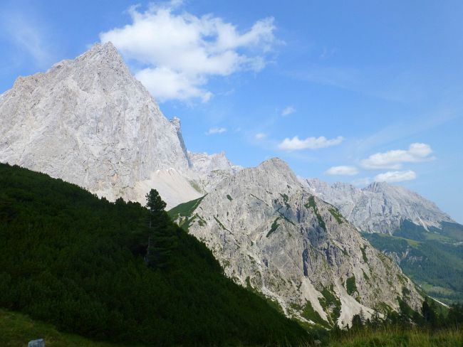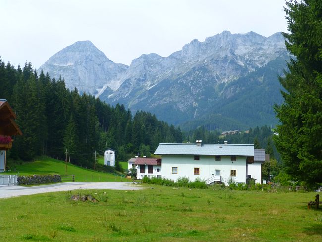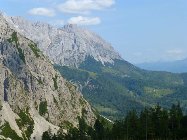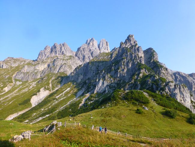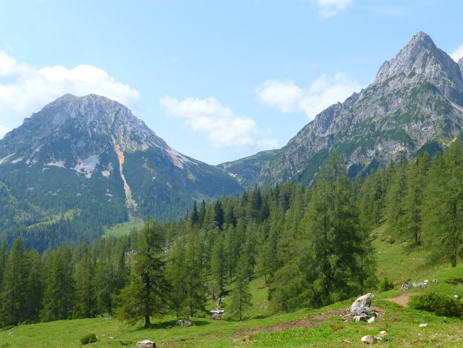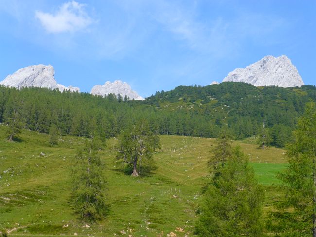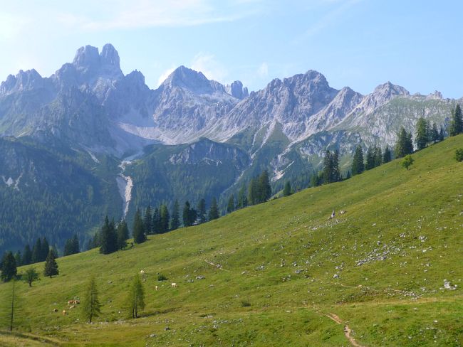 Kontrast: Die Kalkgipfel des Dachsteingebirges und die grünen Wiesenhänge