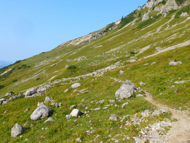steile Wiesenhänge, wo die Wegfindung nicht immer deutlich ist.