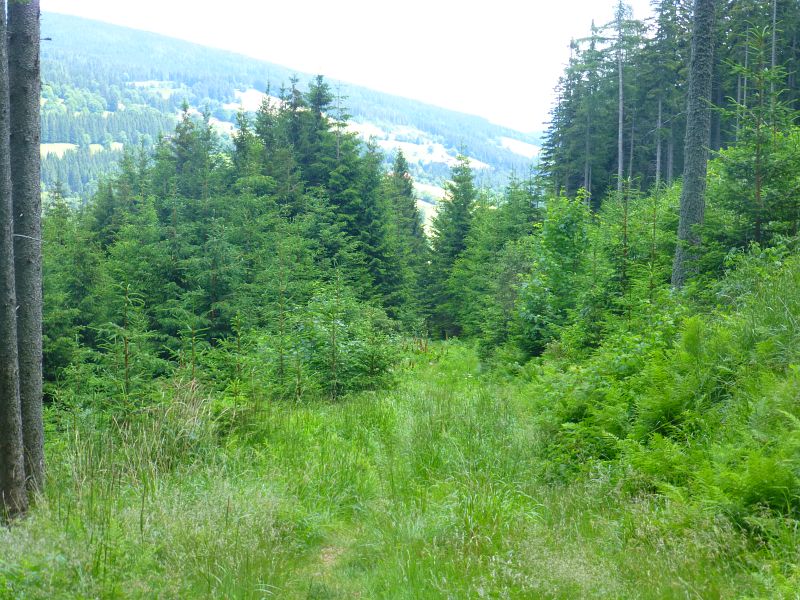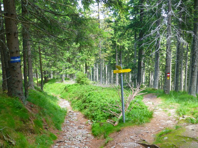ich links entlang der blauen Markierung auf den Almweg ab.
