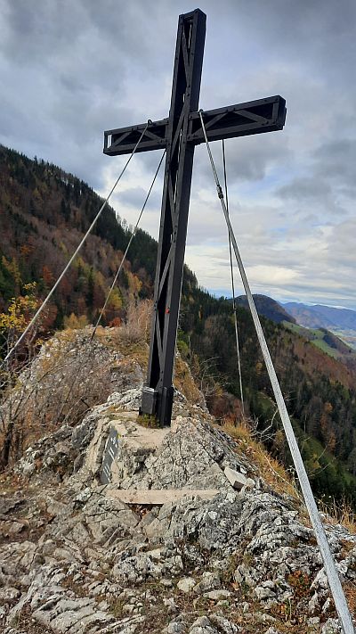 Gipfelkreuz (904m). Der Anstieg ist kurz, steil und felsdurchsetzt