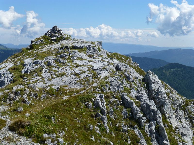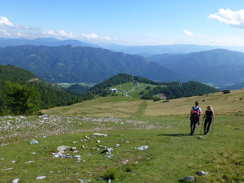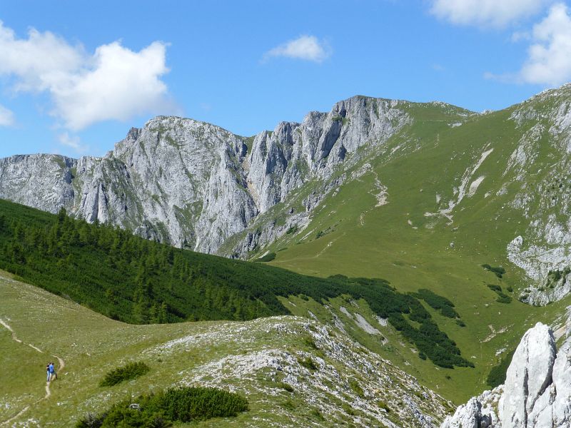Nach einer längeren Pause machen wir uns auf den Rückweg. Der helle Felsen in der Bildmitte ist der Höchstein, dahinter wieder die Veitsch